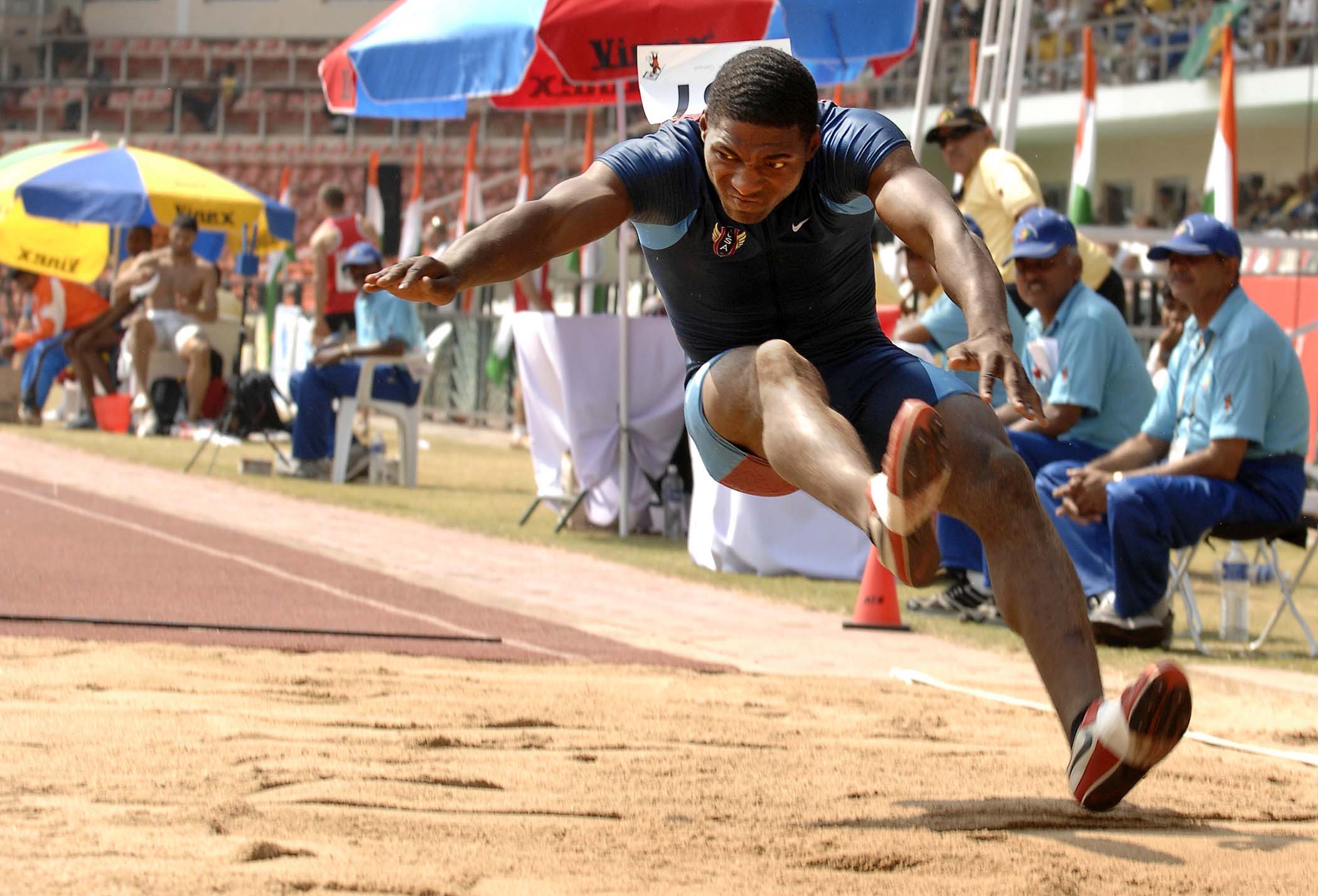 U.S. Army Pfc. Francois Gatson takes a look at the distance measuring board as he prepares to land after a leap in the air during the long jump event in the Conseil Internationale du Sport Militaire’s (CISM) Military World Games in Hyderabad, India, Oct. 17, 2007. The CISM Military World Games is the largest international military Olympic-style event in the world. (U.S. Navy photo by Mass Communication Specialist 2nd Class Marcos T. Hernandez) (Released)